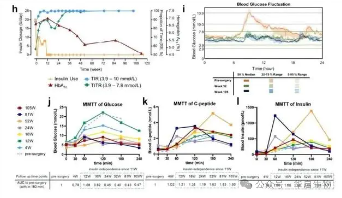 2021年7月19日,由于对低血糖的担忧以及考虑血糖控制不佳对供体肾脏长期生存的不利影响,该患者在上海长征医院接受了自体再生胰岛移植治疗,术后第11周即开始完全脱离外源胰岛素,其口服降糖药(拜糖平、二甲双胍)术后逐步减量,并在第48周和56周实现彻底撤药,目前该患者已彻底脱离胰岛素长达33个月。