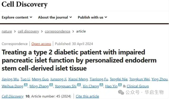 5月7日,记者从海军军医大学第二附属医院(上海长征医院)获悉,4月30日,该院殷浩教授团队联合中国科学院分子细胞科学卓越创新中心程新教授团队,在国际学术期刊《细胞发现》(Cell Discovery)在线发表了题为“Treating a type 2 diabetic patient with impaired pancreatic islet function by personalized endoderm stem cell-derived islet tissue”的研究成果。这是国际上首次利用干细胞来源的自体再生胰岛移植,成功治愈胰岛功能严重受损糖尿病的病例报道。
