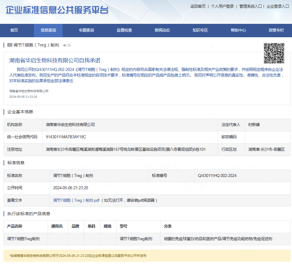在全球Treg临床转化的竞速赛中,华启生物率先以企业标准Q/430111HQ 002-2024破局。该标准于2024年5月6日发布并现行有效,从三大维度构建Treg制剂的品质基准: