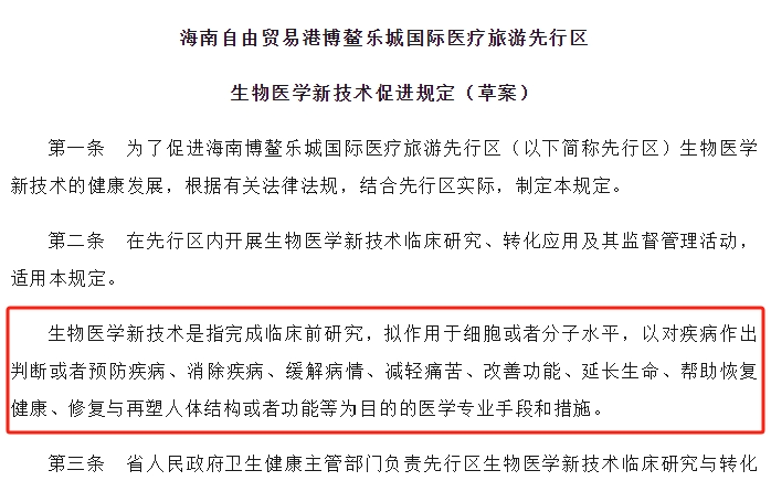 并没有明确规定!但是在之前的《海南自由贸易港博鳌乐城国际医疗旅游先行区条例》和《海南自由贸易港博鳌乐城国际医疗旅游先行区生物医学新技术促进规定(草案)》,都明确指出先行区医疗机构可以在先行区进行干细胞、免疫细胞治疗等新技术的研究和转化应用。此外,草案中还提到了在临床研究的基础上开展转化应用,这包括干细胞技术在内的生物医学新技术。