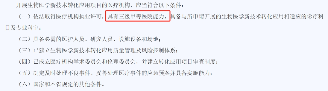 需要三甲医院门槛:根据2024年11月29日海南审议通过的《海南自由贸易港博鳌乐城国际医疗旅游先行区生物医学新技术促进规定》,自2025年2月1日起,在先行区内开展细胞治疗、基因治疗、组织工程等生物医学新技术临床研究、转化应用及其监督管理活动,必须在具备三甲资质的医疗机构内开展。