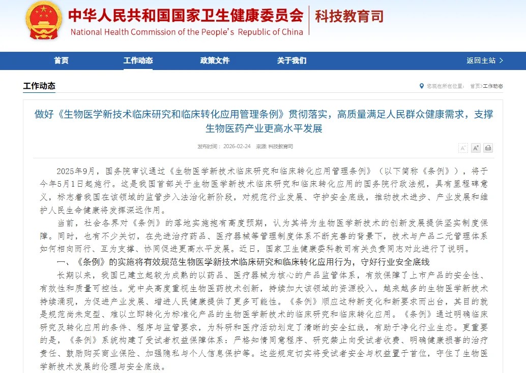 2月24日,国家卫健委就《生物医学新技术临床研究和临床转化应用管理条例》贯彻落实工作进行说明,进一步明确将于今年5月1日起施行的《生物医学新技术临床研究和临床转化应用管理条例》(以下简称《条例》)的落地路径。